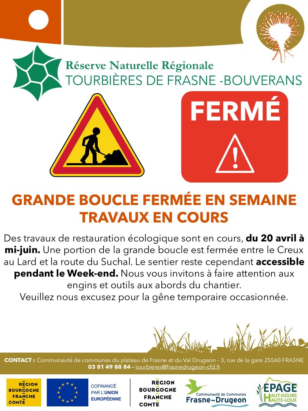Des travaux de reméandrement d’un cours d’eau, réalisés par l'EPAGE Haut-Doubs Haute-Loue sont actuellement en cours et se poursuivront jusqu’à mi-juin, date à laquelle la Grande Boucle sera de nouveau entièrement accessible.