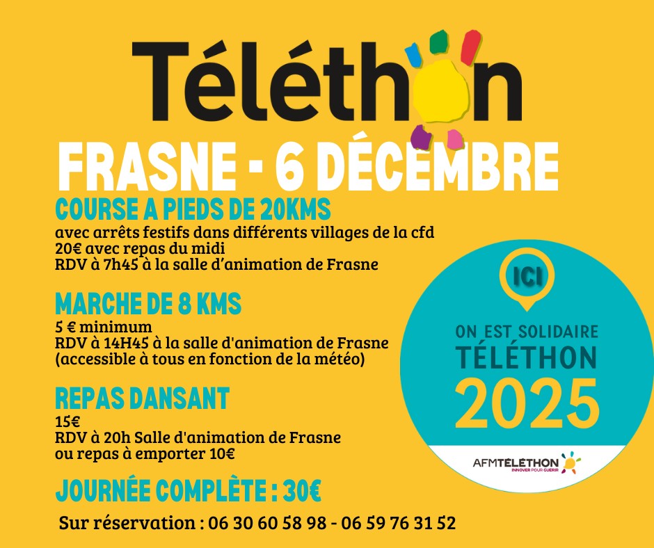 - Repas dansant : 15€ Salle d'animation de Frasne à partir de 20H ou repas à emporter 10€