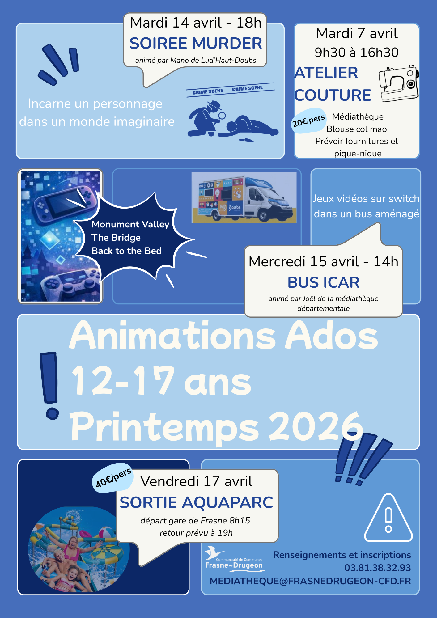 Vous trouverez ci-joint les animations proposées par Mariève BONNET, animatrice jeunesse à la CFD pour les ados (12-17 ans), pendant les vacances scolaires d'avril.